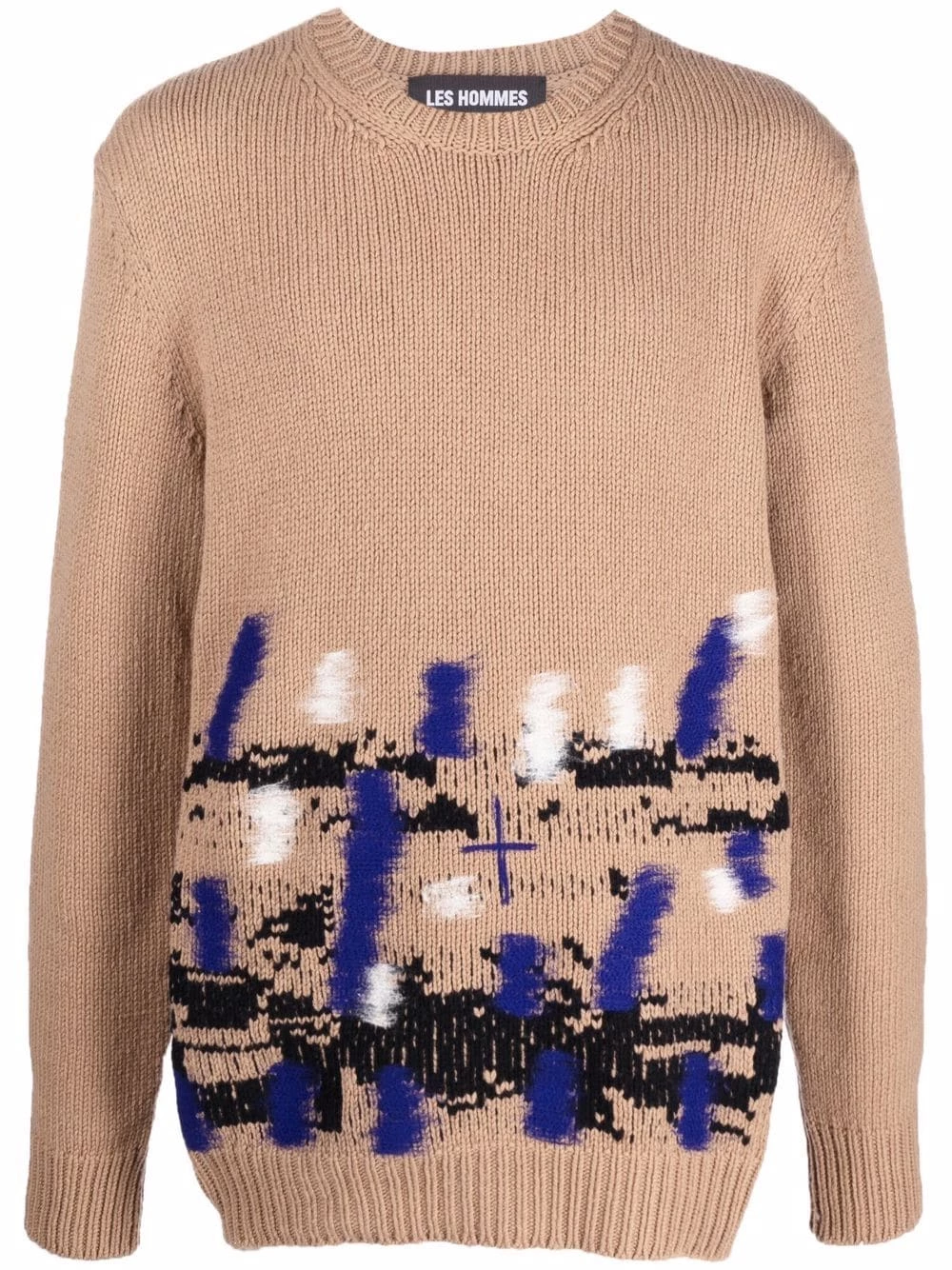 Les Hommes adds an unexpected twist to the classic jumper silhouette. Spun from soft virgin wool, this knitted piece features a distinct intarsia-knit abstract pattern to the front.