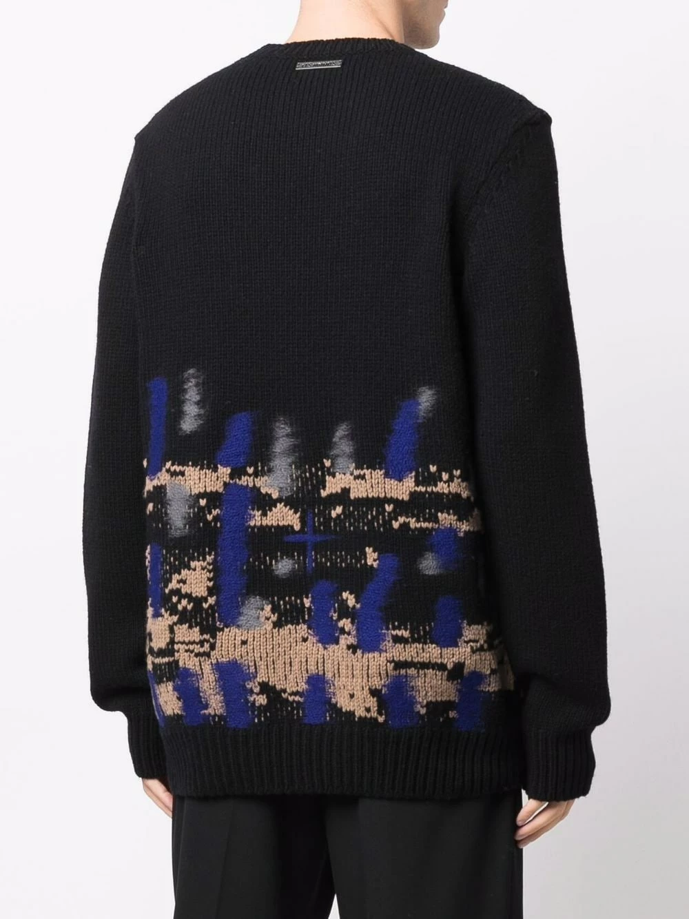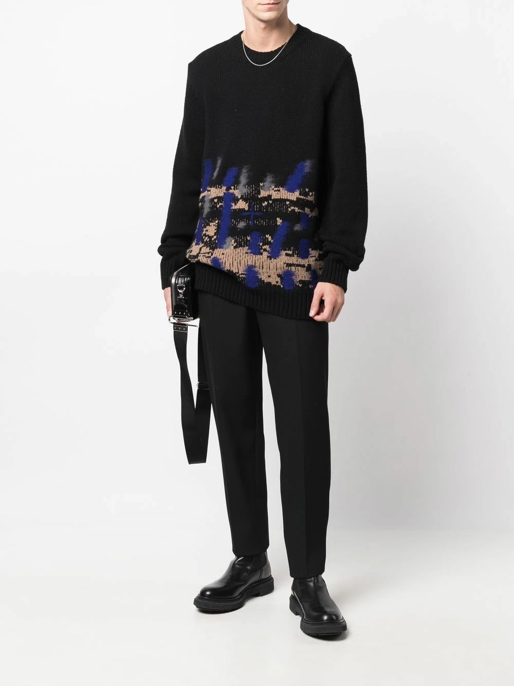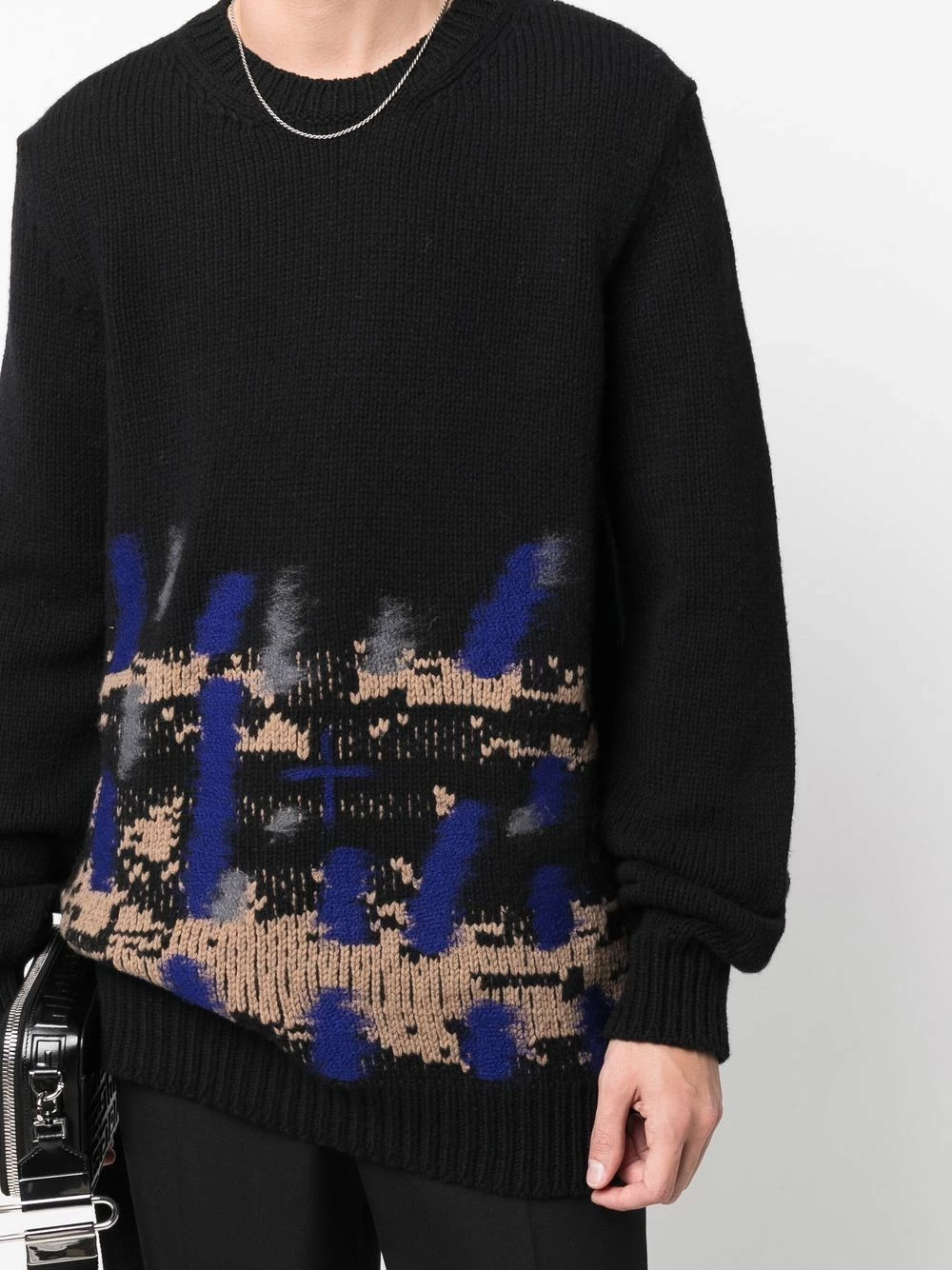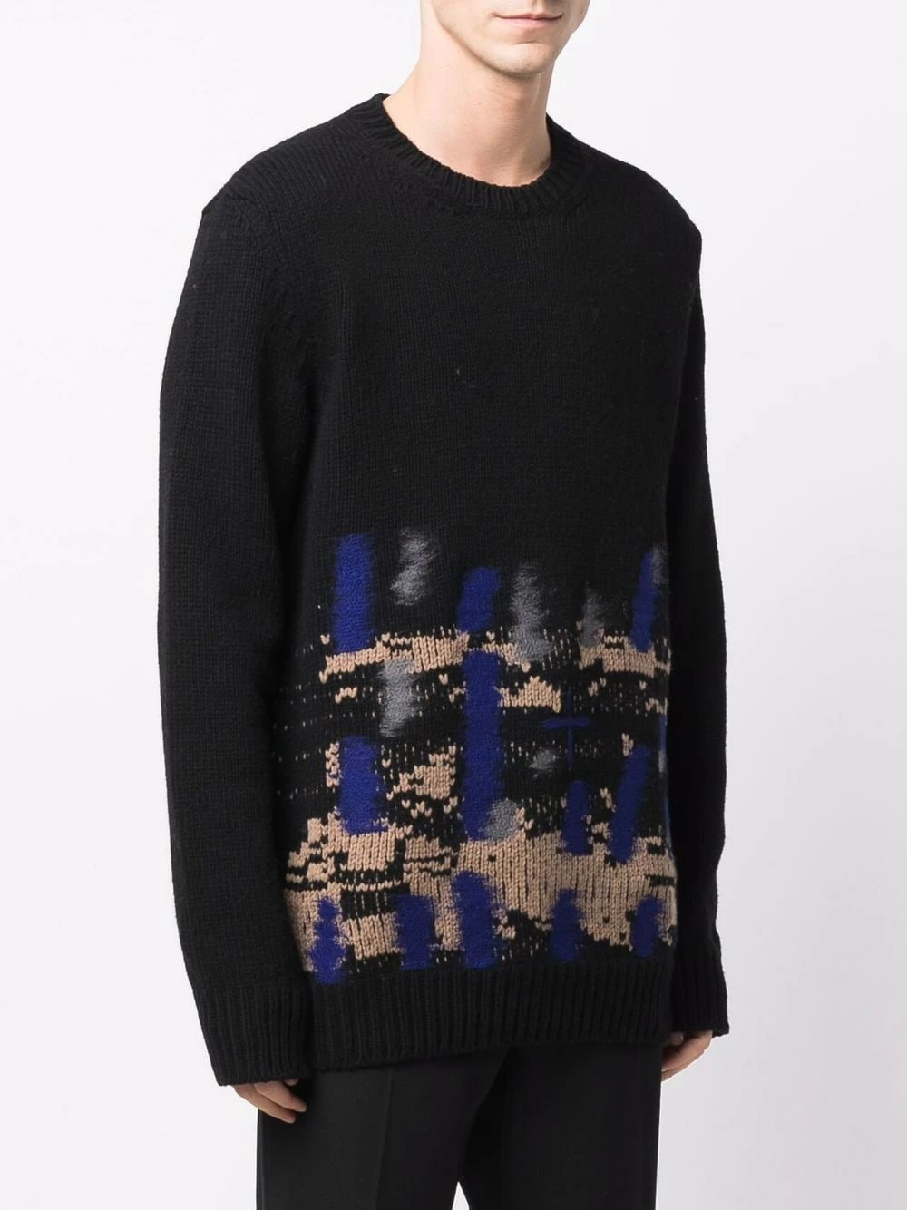 Les Hommes adds an unexpected twist to the classic jumper silhouette. Spun from soft wool, this knitted piece features a distinct intarsia-knit abstract pattern to the front.