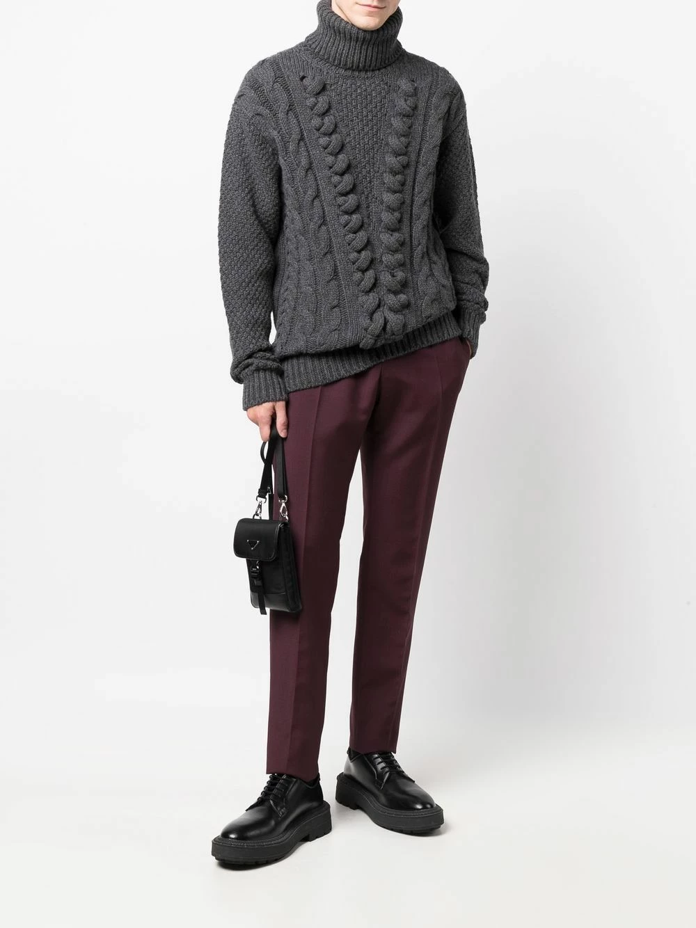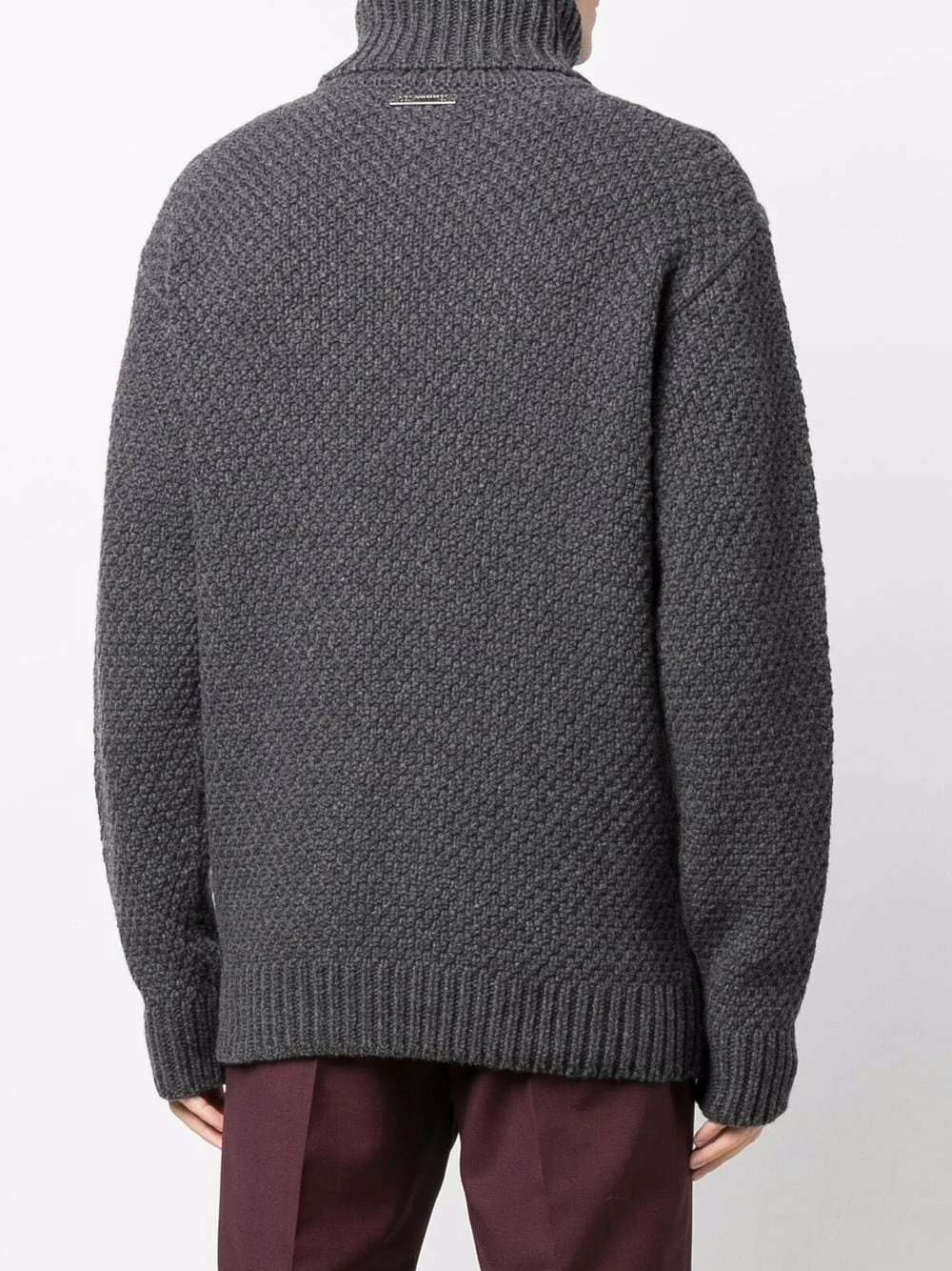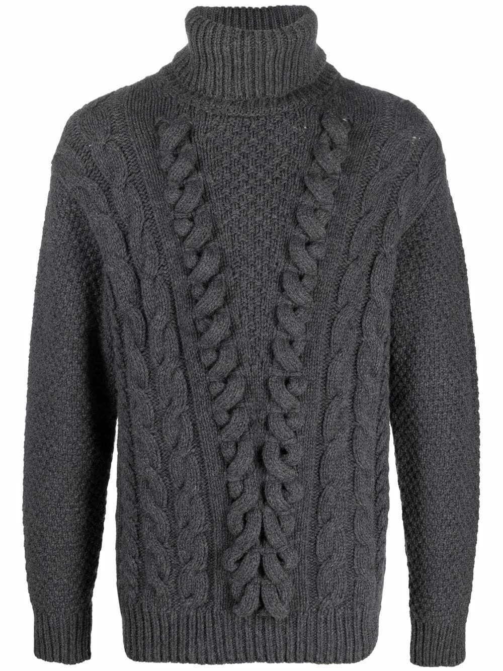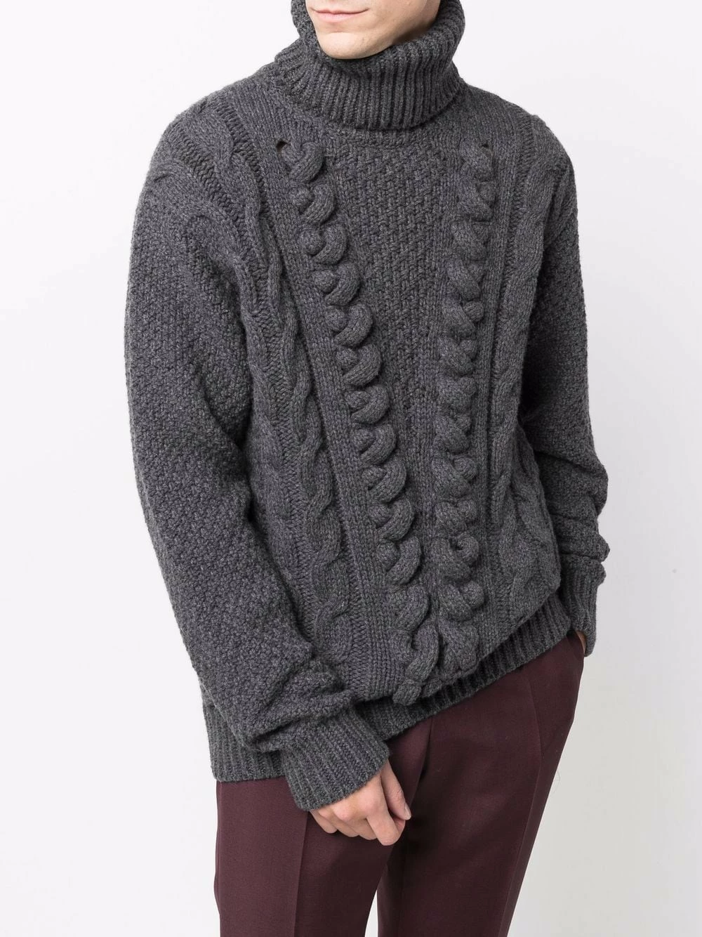 Les Hommes reinvents the cable knit jumper with unexpected details. Spun from sumptuous virgin wool in a charcoal grey hue, this jumper comes with an elegant roll neck and a knitted voluminous detail across the front.