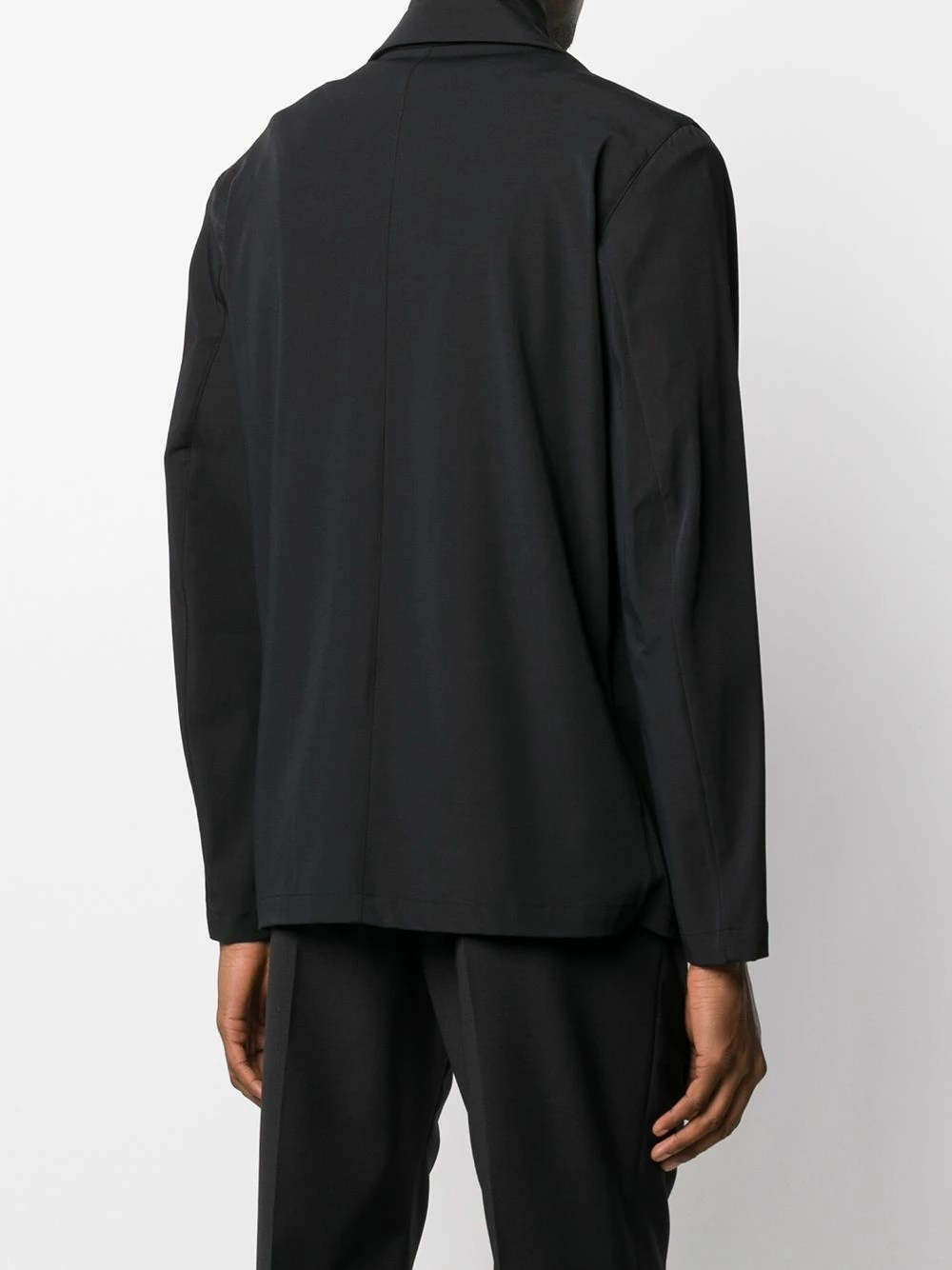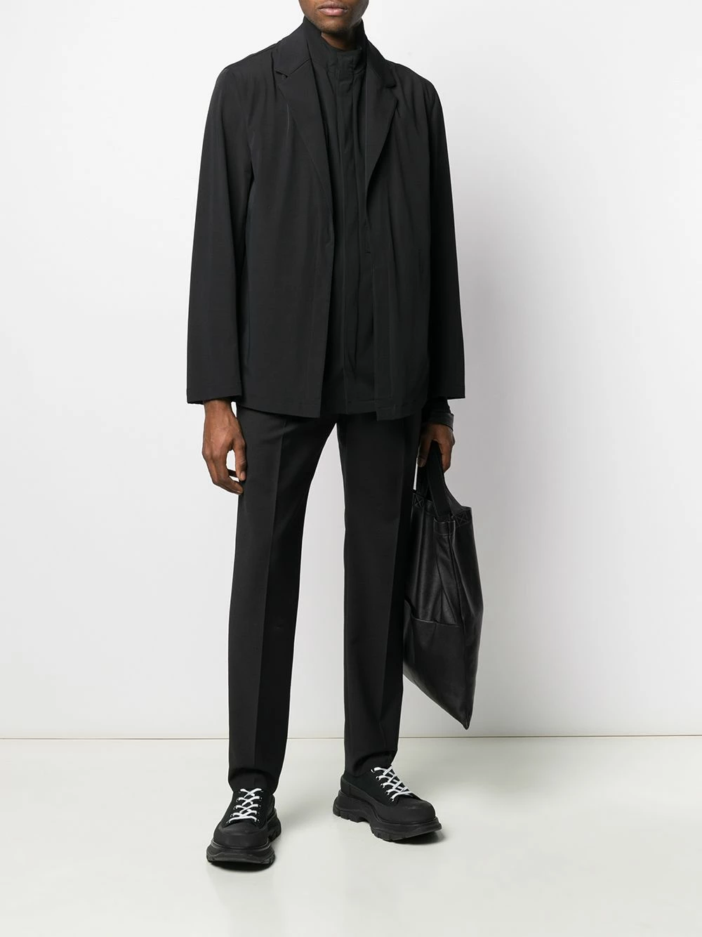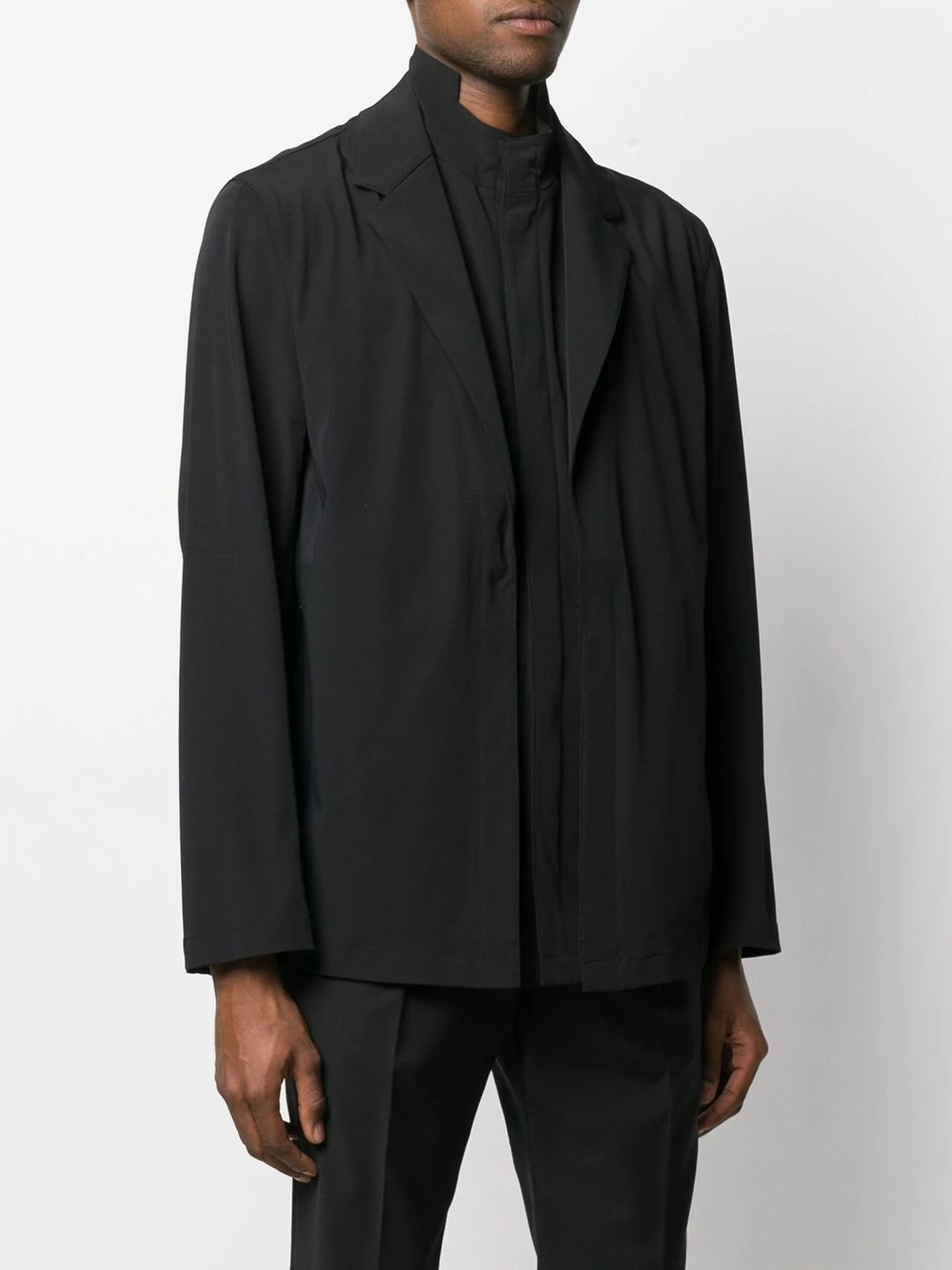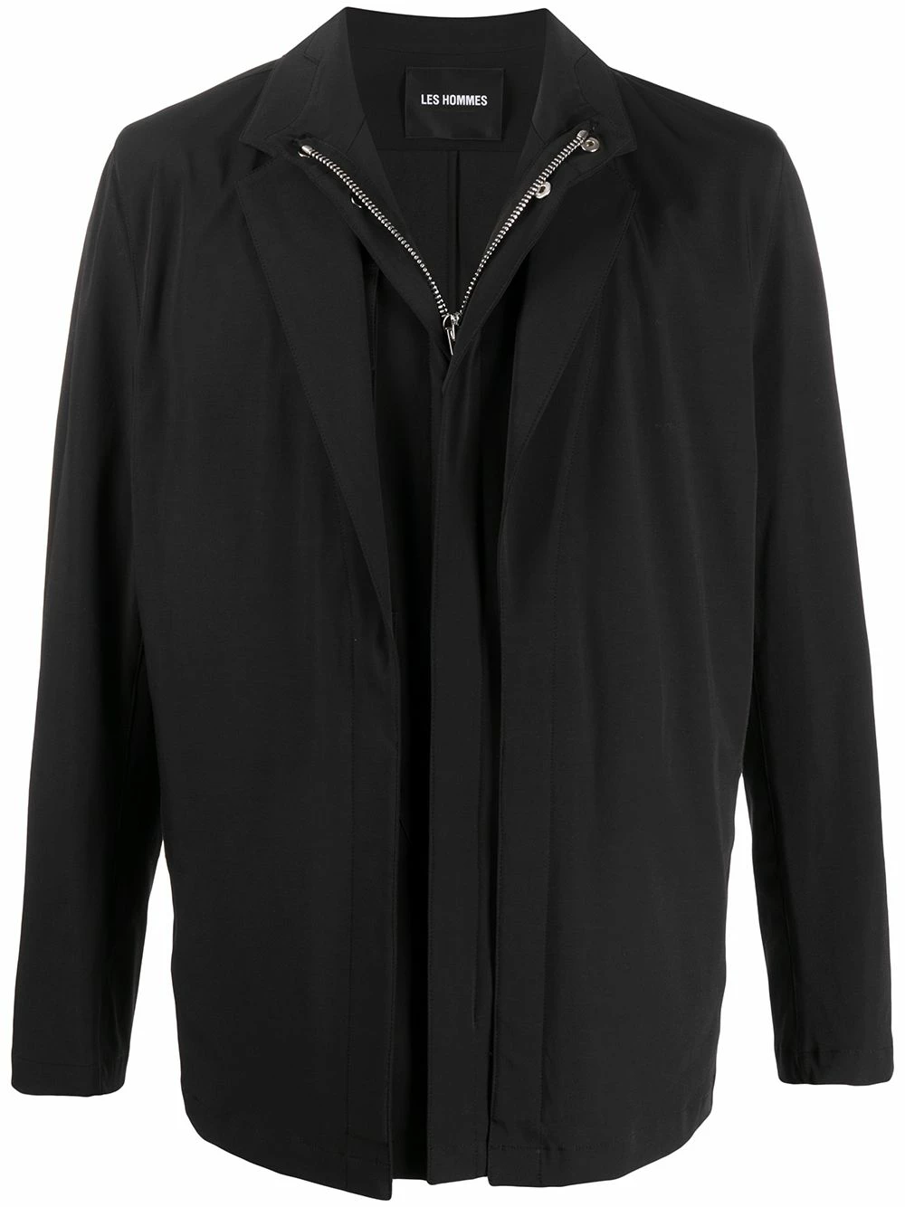 Black cotton blend layered zip-up jacket from Les Hommes featuring classic lapels, a front zip fastening, long sleeves, front pockets and a straight hem.