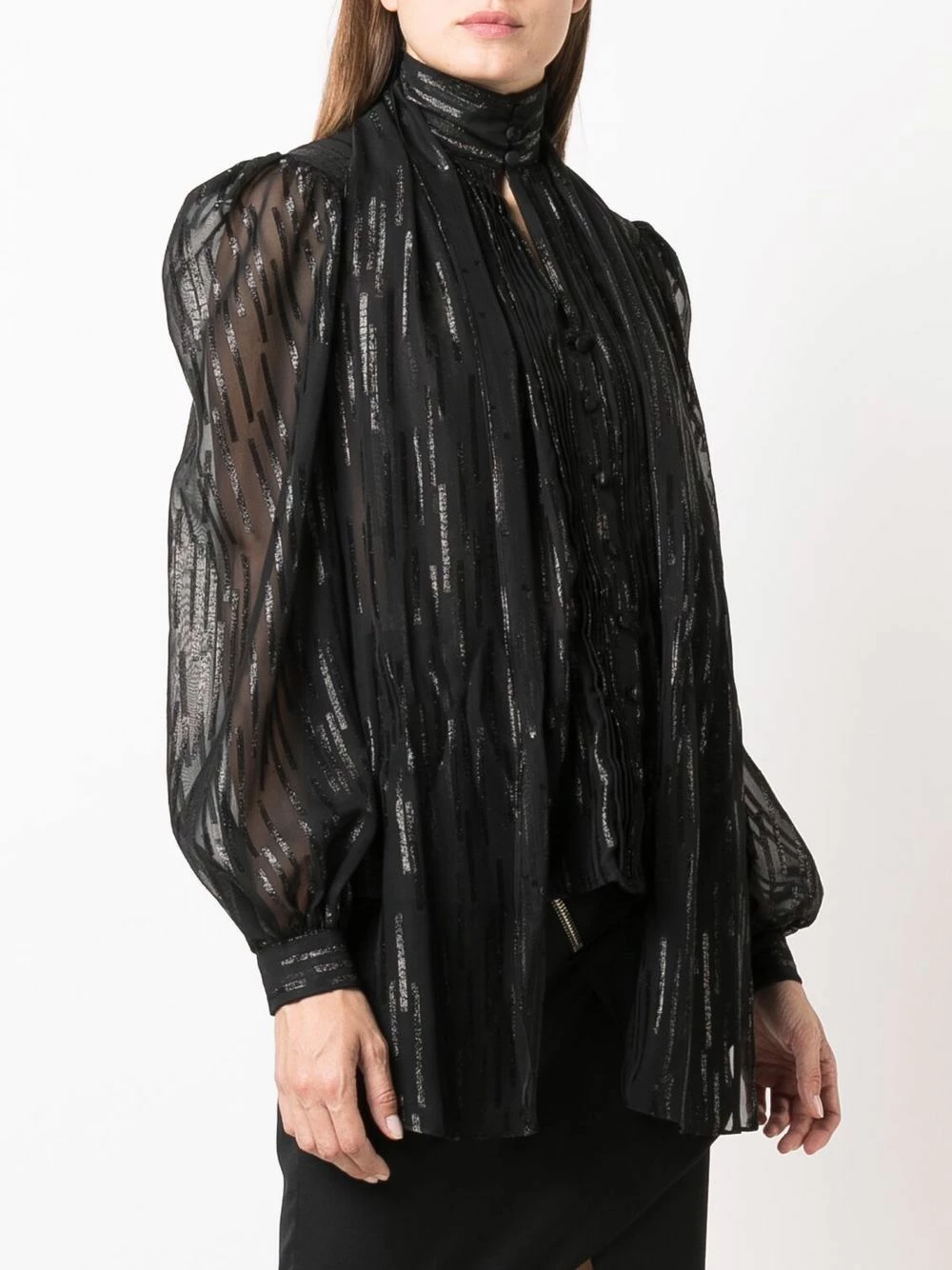 Black lurex-detail blouse from LES HOMMES featuring lurex detailing, pussy-bow collar, long sleeves and semi-sheer construction.