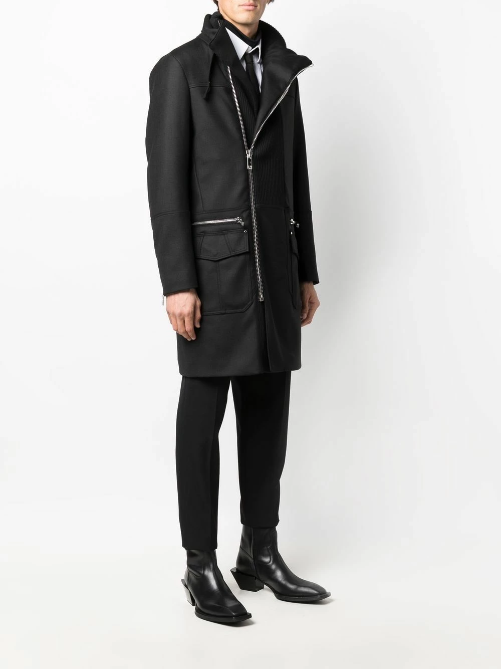 Crafted from a virgin wool blend in a black tone, this zip-up coat from Les Hommes is finished with a quilted lining for added insulation.