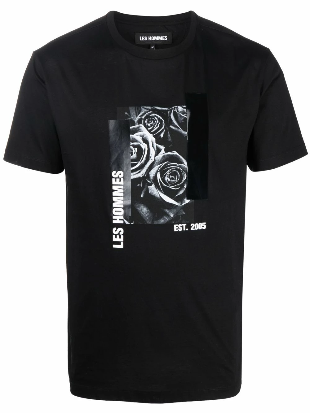 Synonymous with contemporary appeal, Belgian brand Les Hommes is characterised by their laid-back spirit, perfectly captured by this black T-shirt and its relaxed cut. Presented in classic black, the piece is finished with a branded rose print to the front.Â