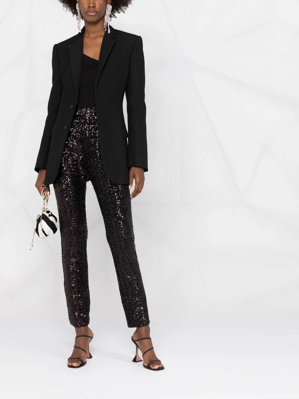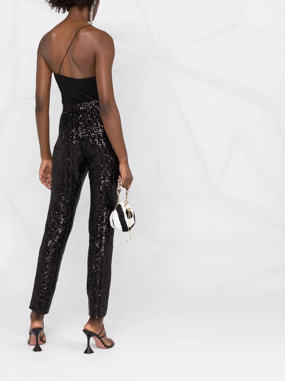 Black stretch-fit sequin embellished trousers from LES HOMMES featuring stretch-design, sequin embellishment, high-waisted, two side slash pockets and tapered leg.